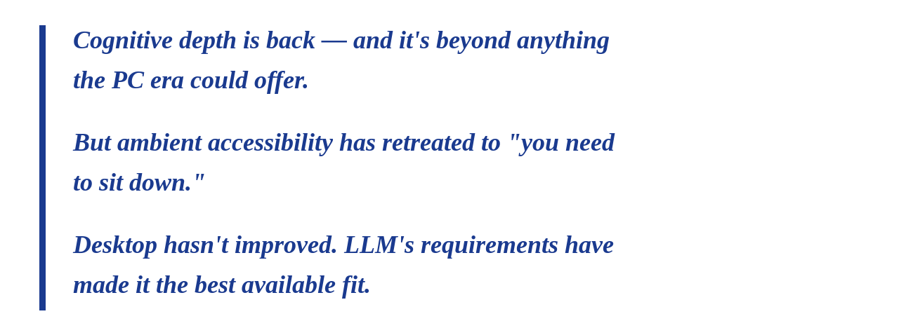 Desktop + LLM: Cognitive depth surges — ambient accessibility retreats to the desk