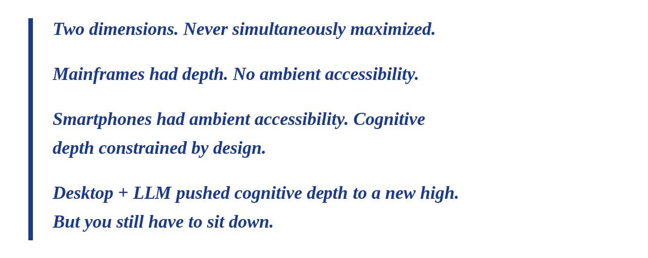 A visible tension now exists: cognitive computing demands “sit down and think deeply,” while the smartphone demands “respond instantly, anywhere.” These are mutually exclusive design requirements. Before LLMs, this tension was nearly invisible. LLMs made the invisible visible.