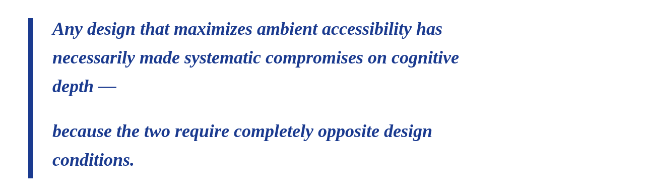 This philosophy pushed ambient accessibility to its human limit: two billion people, supercomputers in their pockets, available at any moment. But achieving this required systematically compressing everything cognitive depth depends on — single-window interfaces eliminated parallel information processing; fragmented attention patterns destroyed context maintenance; touch-first input constrained long-form text entry.