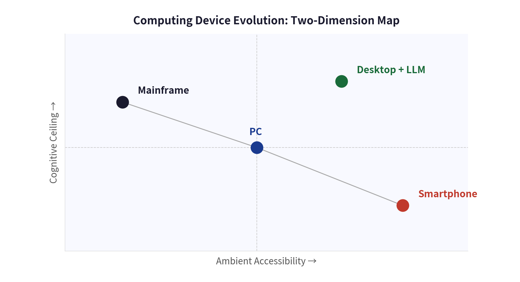 Before LLMs, this tradeoff was reasonable. But when software’s cognitive depth requirements exceed what the smartphone’s design can support, software starts forcing hardware’s hand. Every time this mismatch has appeared in history, device designs have been rebuilt: mainframes couldn’t serve individuals, so PCs appeared; PCs couldn’t serve mobile needs, so smartphones appeared; smartphones constrain cognitive depth, and the next device is being forced into existence.