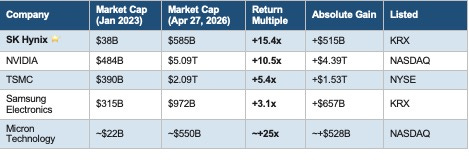 From a $38B market cap in January 2023 to approximately $585B on April 27, 2026, SK Hynix delivered a +15.4x return — surpassing NVIDIA (+10.5x), TSMC (+5.4x), and Samsung (+3.1x). On raw multiples, Micron’s ~+25x leads the group, but that figure is heavily distorted by a historically depressed base: the company was deep in the red in January 2023, with a market cap of only ~$22B. Stripping out that base effect, SK Hynix’s +15.4x from a normal starting point represents the most structurally meaningful re-rating of the AI supercycle.