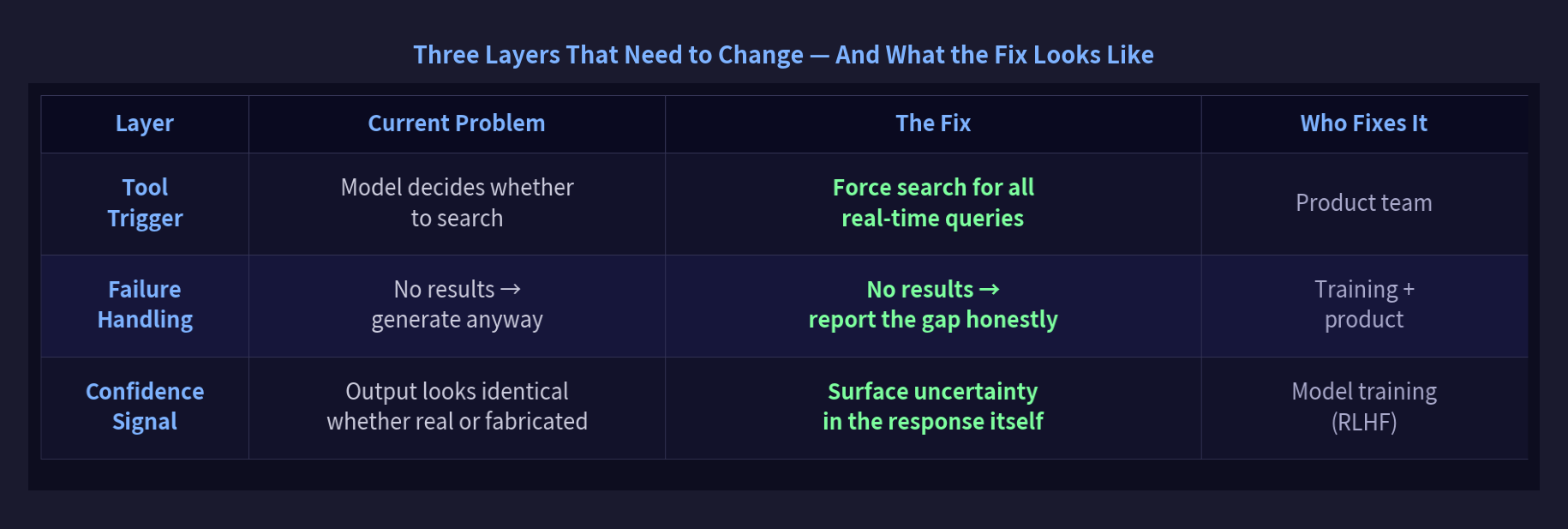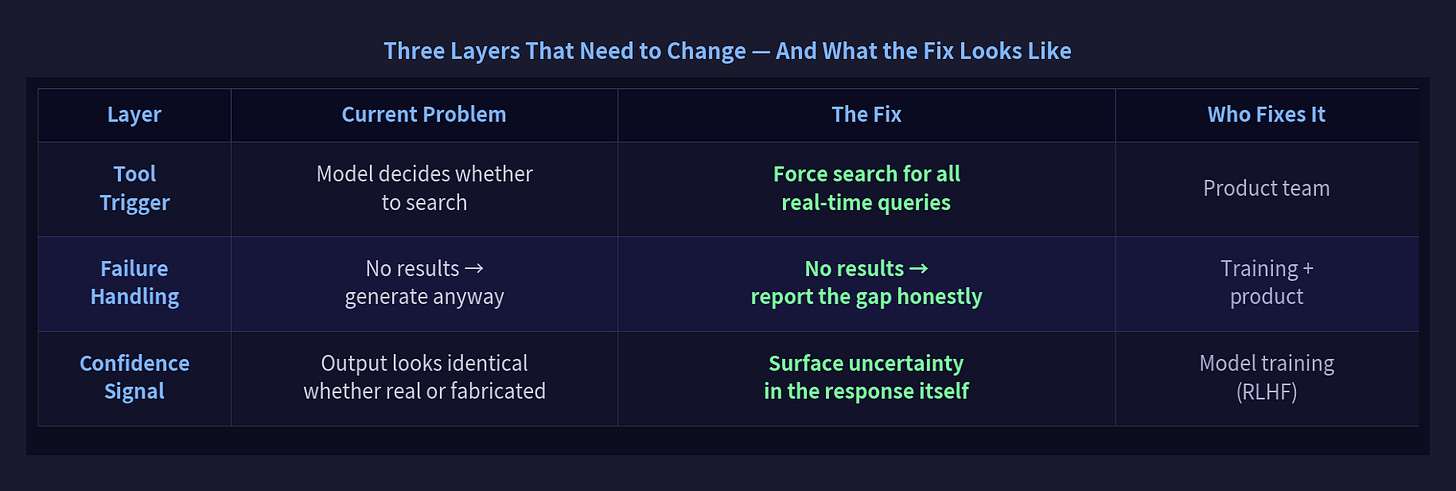 The failure handling fix requires training-level changes. The model needs to learn that “I searched and found nothing” is better than fabricating results. That’s a matter of what behaviors get rewarded in RLHF.
