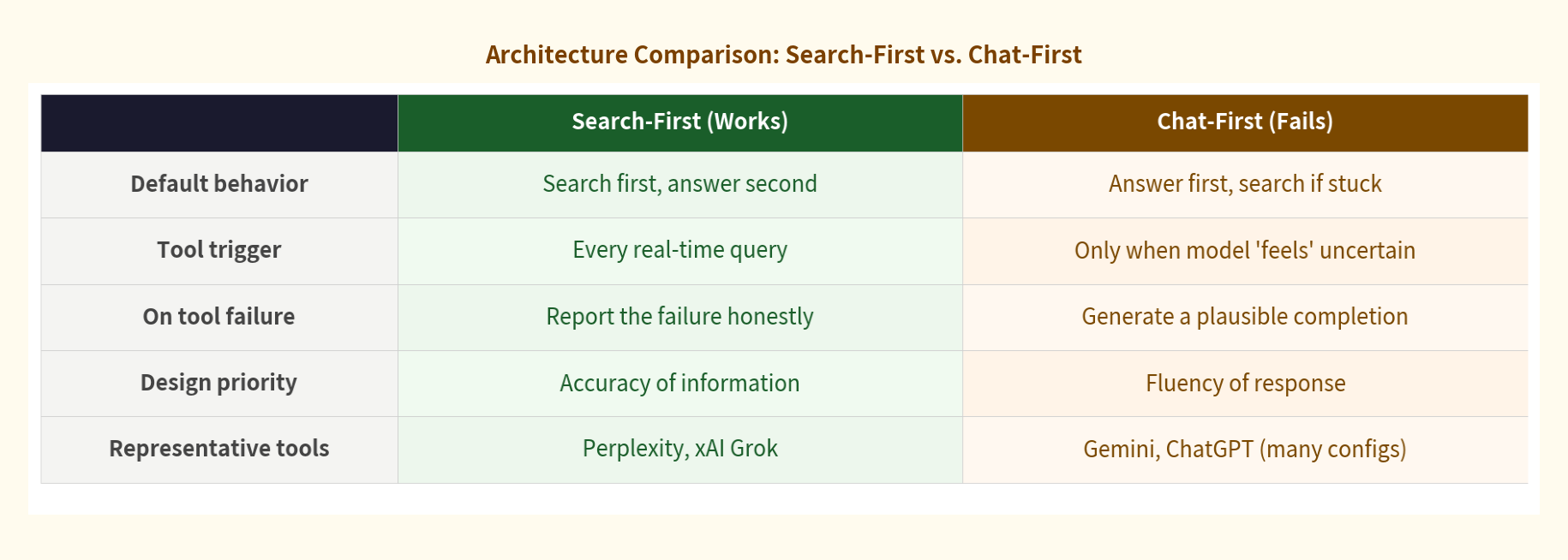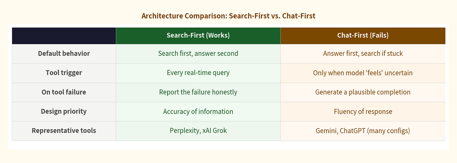 First, architecture is now a tool selection criterion. When you choose an AI tool for any task involving real-world or time-sensitive information, the relevant question isn’t “which model is most capable?” It’s: what does this tool’s architecture do at the boundary of what it can deliver? Search-first tools fail loudly or return real results. Chat-first tools can fail silently, with confidence. For research or any context where accuracy matters more than fluency, that distinction is the one that matters.