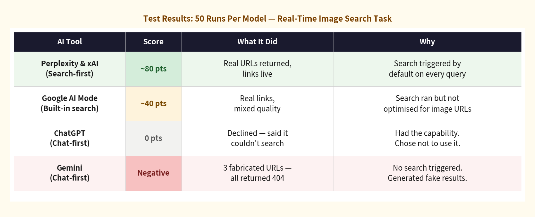I ran the same prompt 50 times on each of four major AI tools. The results split clearly in two. Some tools found real images consistently. Others didn’t — but failed in completely different ways. Understanding why turns out to be more useful than the score.