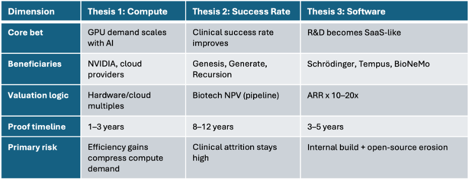 The most tractable near-term thesis: AI converts portions of drug discovery into software — recurring, scalable, subscription-based.
