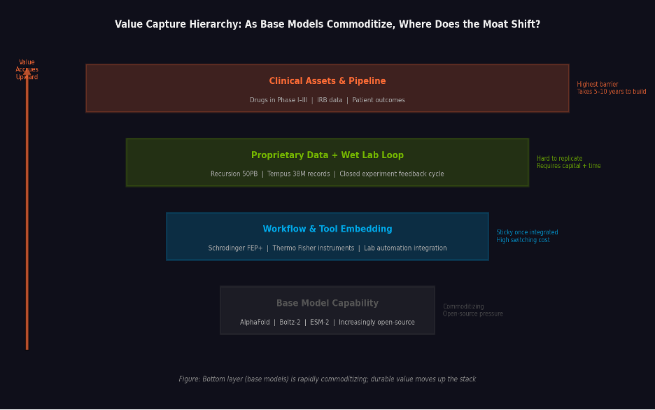 The practical investor question: which layer are you buying, and is that layer’s moat widening or eroding? Many current valuations in this space conflate layers — pricing companies as if they have clinical asset depth when their actual differentiation is at the tool layer, or vice versa.