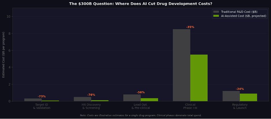 Figure 6. Estimated AI impact on R&D costs by stage. Value concentration in early discovery; clinical phases dominate total spend.