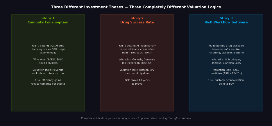 Knowing which thesis you’re buying is more important than which company. Many investors use SaaS multiples to value companies whose actual economics are biotech NPV — or wait with biotech patience for companies that should be held to SaaS growth accountability. Both produce wrong conclusions.