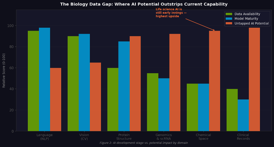 Figure 1. AI development maturity vs. potential impact by domain. Life sciences sits at the bottom-left: least mature, highest upside.